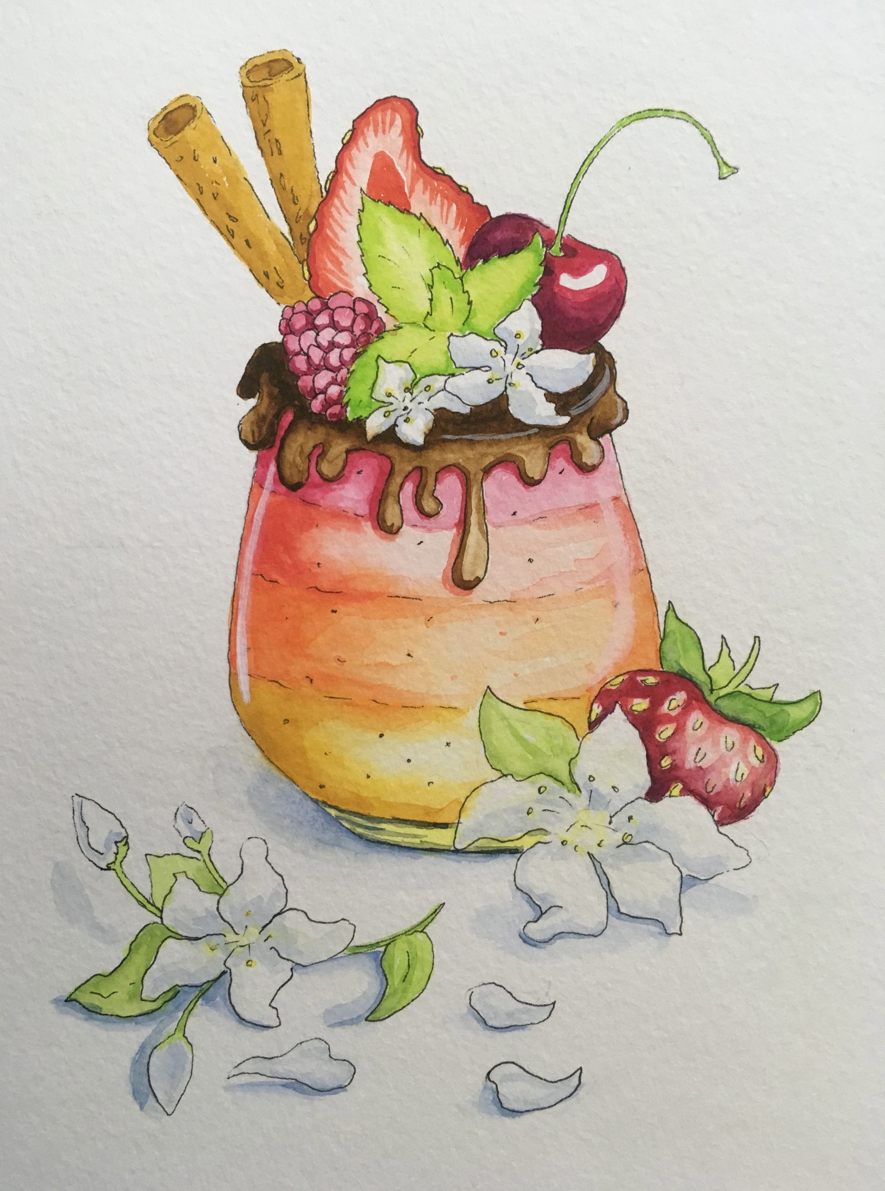 Радужный десерт Автор: Наталья Болдырева Акварель по урокуКупить на Ярмарке мастеров десерт, иллюстрация, коктейль, акварель 410 Пожаловаться