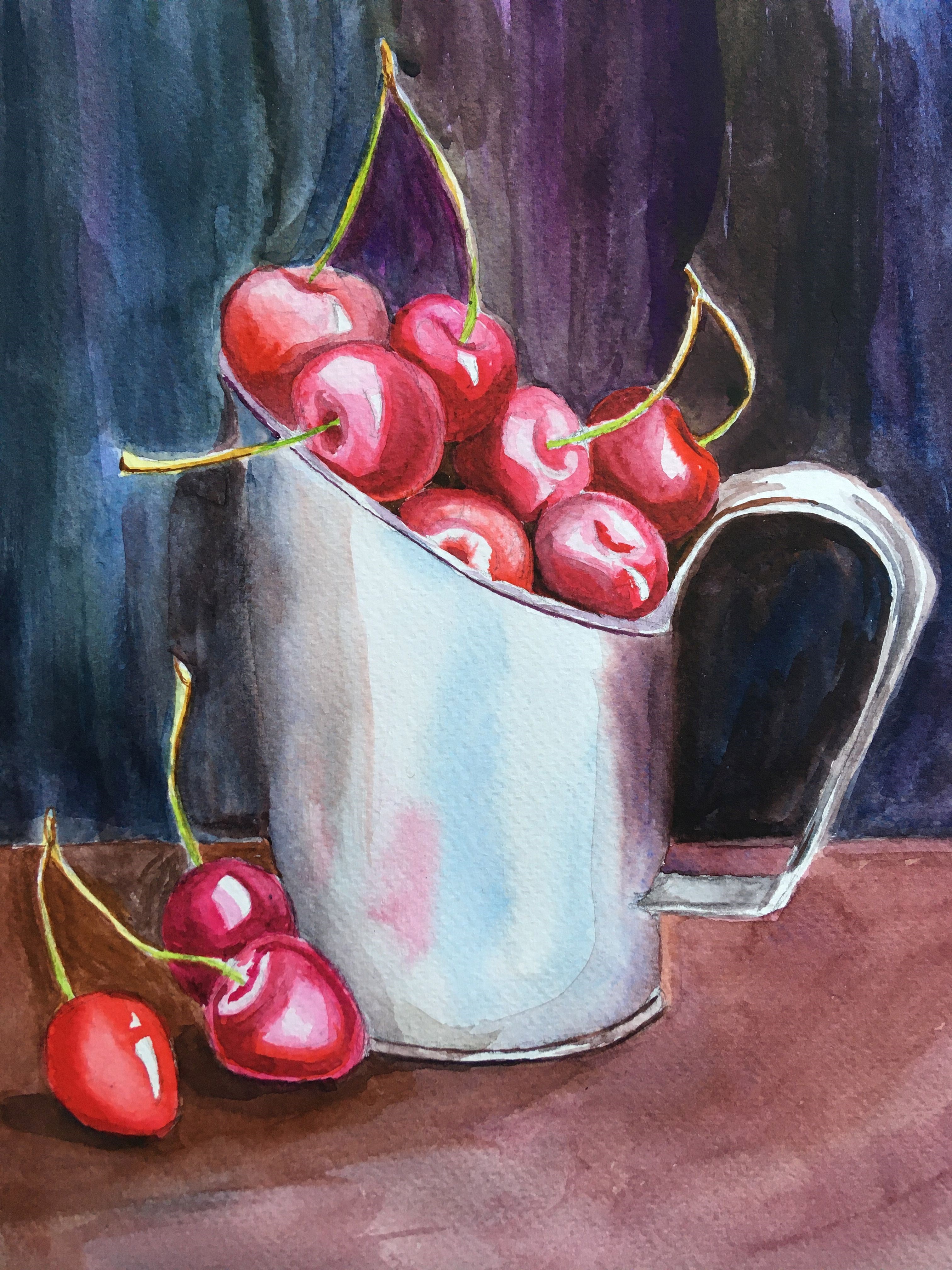 Вишни в кружке Автор: Наталья Болдырева Акварель по урокуКупить на Ярмарке Мастеров кружка, металл, натюрморт, фрукты, акварель, вишня 481 Пожаловаться
