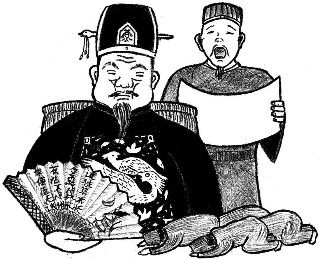 Тао Ханьло согнул руку в локте и качнул указательным пальцем. Я понял, что разговаривать с нами он, похоже, не собирается. Рядом с креслом тут же возник чиновник со свитком в руке.