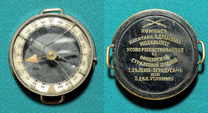 Компас военного картографа В. Н. Адрианова был разработан в 1907 году и в 1911 принят на снабжение Русской армии.