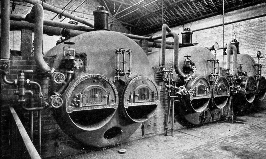Шотландский судовой котёл с пароперегревателем в дымоходе. Это уже переходная модель к водотрубным котлам.
