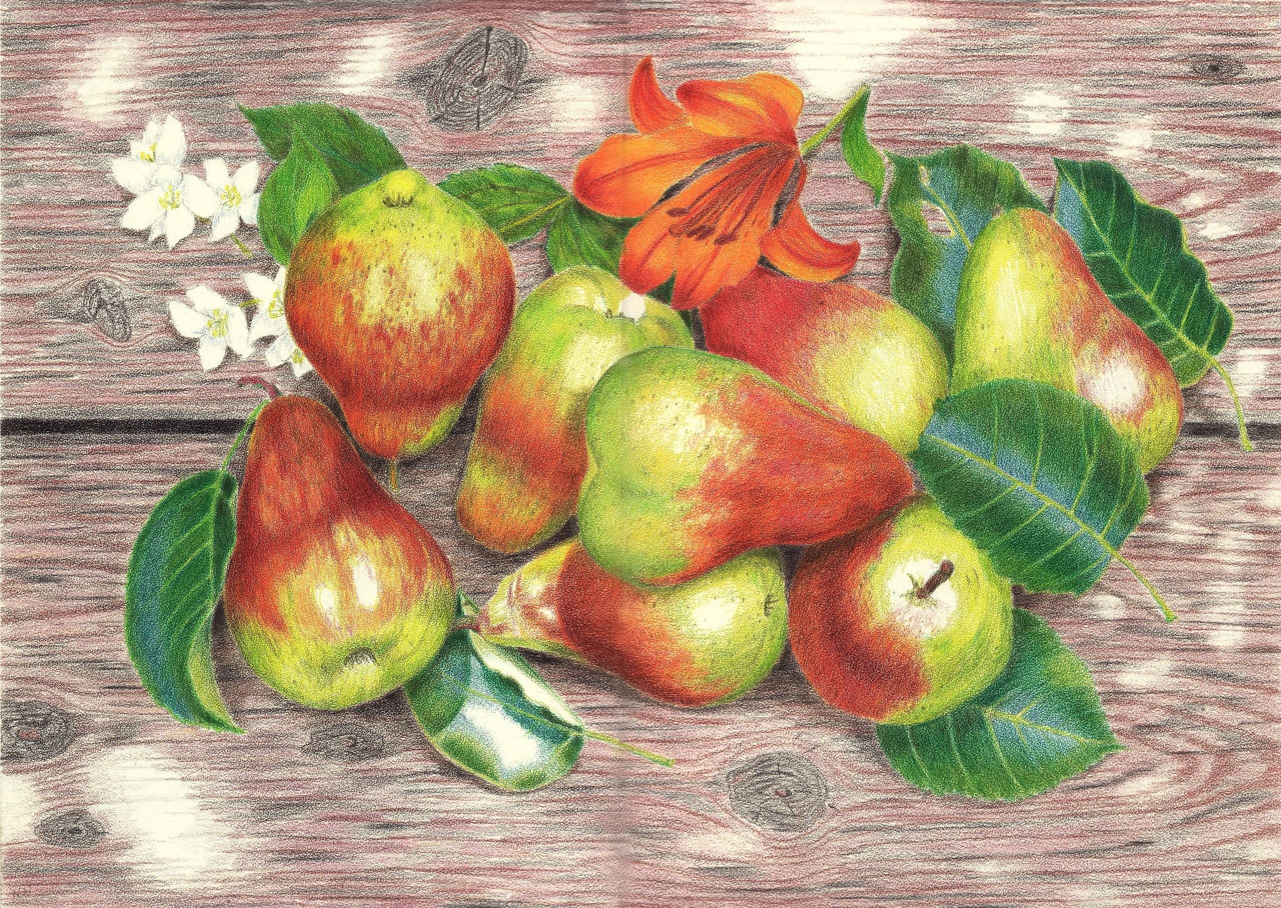 Груши, естественно, покупные: свои к тому времени ещё не выросли, а листья нарвала с собственного дерева и цветочки кинула, что под руку попались. Таковы мои примитивные представления о композиции