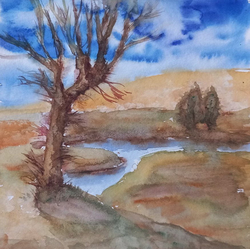 Позднеосеннее Автор: Ольга Левонович Онлайн-курс "Цветовидение". Контраст третичных цветов. Акварелька написана по моему фото.Акварель, скетчбук 20х20. иллюстрация, акварель 110 Пожаловаться
