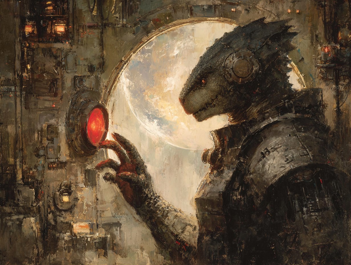 A reptilian alien reaches for a large red button. In the background is a spaceship cabin, with planet Earth visible through the porthole. Art by Jakub Rozalski and by Giger --chaos 15 --ar 4:3 --profile iomhvnn --stylize 150