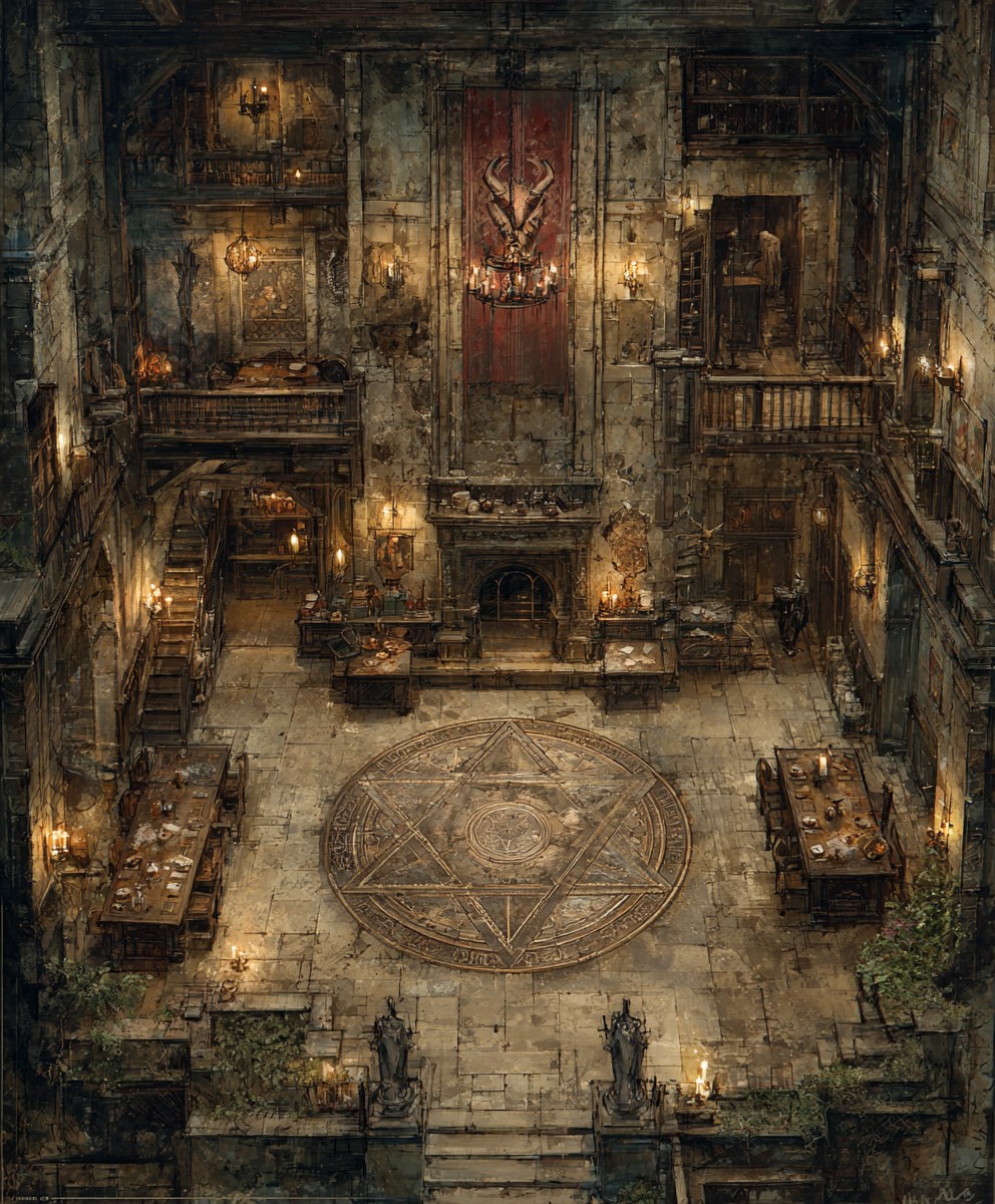 A demon appears in the center of a pentagram. Room in a medieval tower. D&D style. --chaos 10 --ar 5:6 --profile iomhvnn --stylize 350
