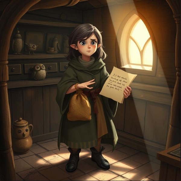 Сцена в крошечном, пыльном совятнике. Нимфадора Тонкс в потершем плаще стоит среди плавающих в воздухе пылинок, ловя тяжелый кошель с галеонами, только что выпавший из щели в полу. В руке она держит записку на гладком пергаменте. Ее выражение — смесь полного недоумения и зарождающейся озорной усмешки. Единственный солнечный луч пробивается сквозь мрак, освещая кошель и записку. Атмосфера магическая, слегка заброшенная, с старым деревом и слабым магическим свечением. Стиль характерной иллюстрации, контраст теплого и холодного света, детализированные текстуры.