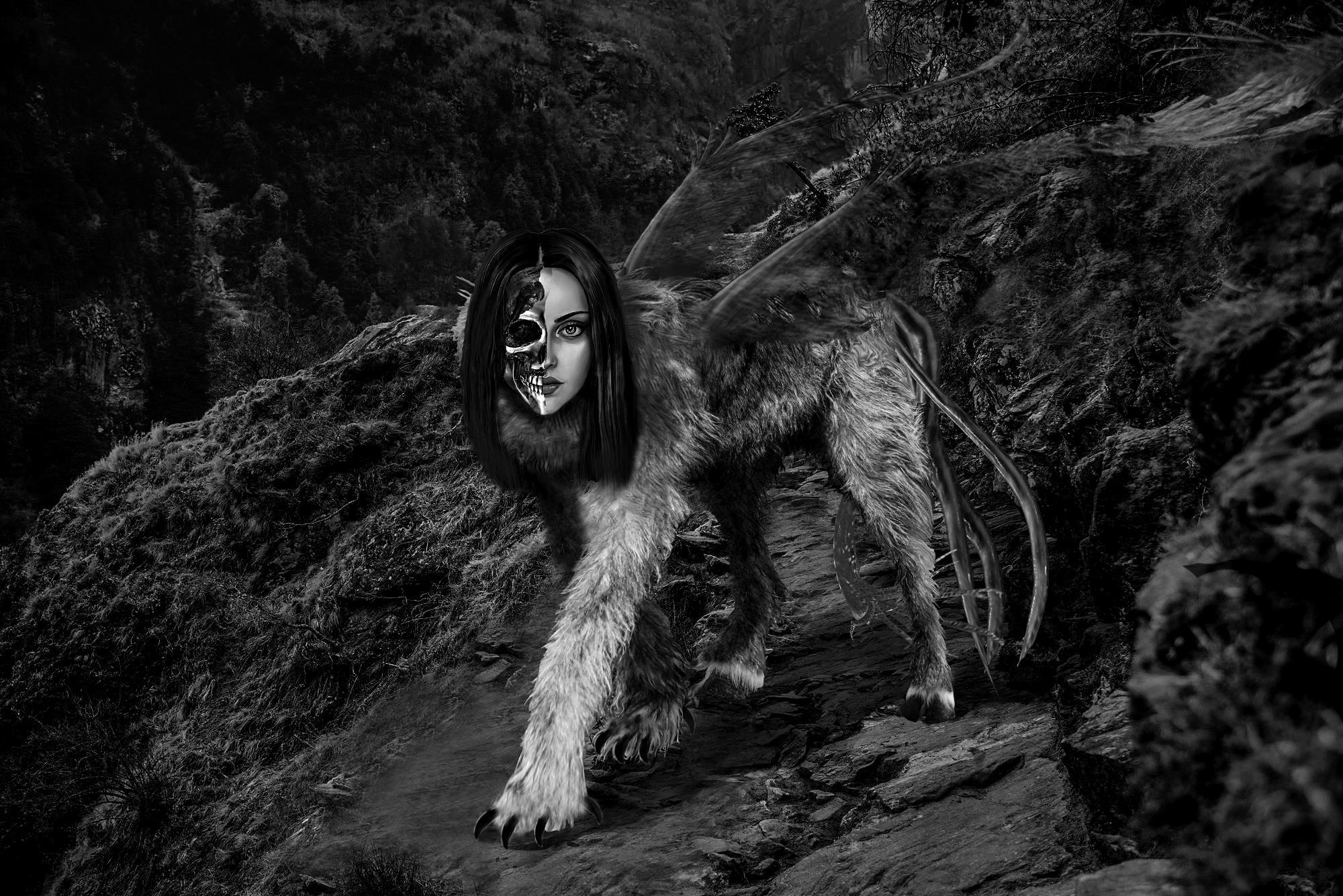 Когда существо подняло голову, Кэртиллона лишь с трудом удержалась от того, чтобы закричать. Это было бледное лицо-маска, одна половина которого представляла собой прекрасный женский лик: красивый изгиб рта, ямочка на щеке, тонкая бровь, ведущая к ровной переносице, глубокий нежно-голубого цвета глаз, - другая же являла собой мерзость, рождённую гротескным искажением всё той же красоты. Здесь уже рот представлял собой оскал крупных человеческих зубов, вокруг которых словно срезали кожу. То же отсутствие плоти наблюдалось и в других её частях: тёмная впадина на месте щеки с натянутыми в ней жилами, белая потрескавшаяся кость вокруг пустой глазницы, кровавые трещины в области лба...