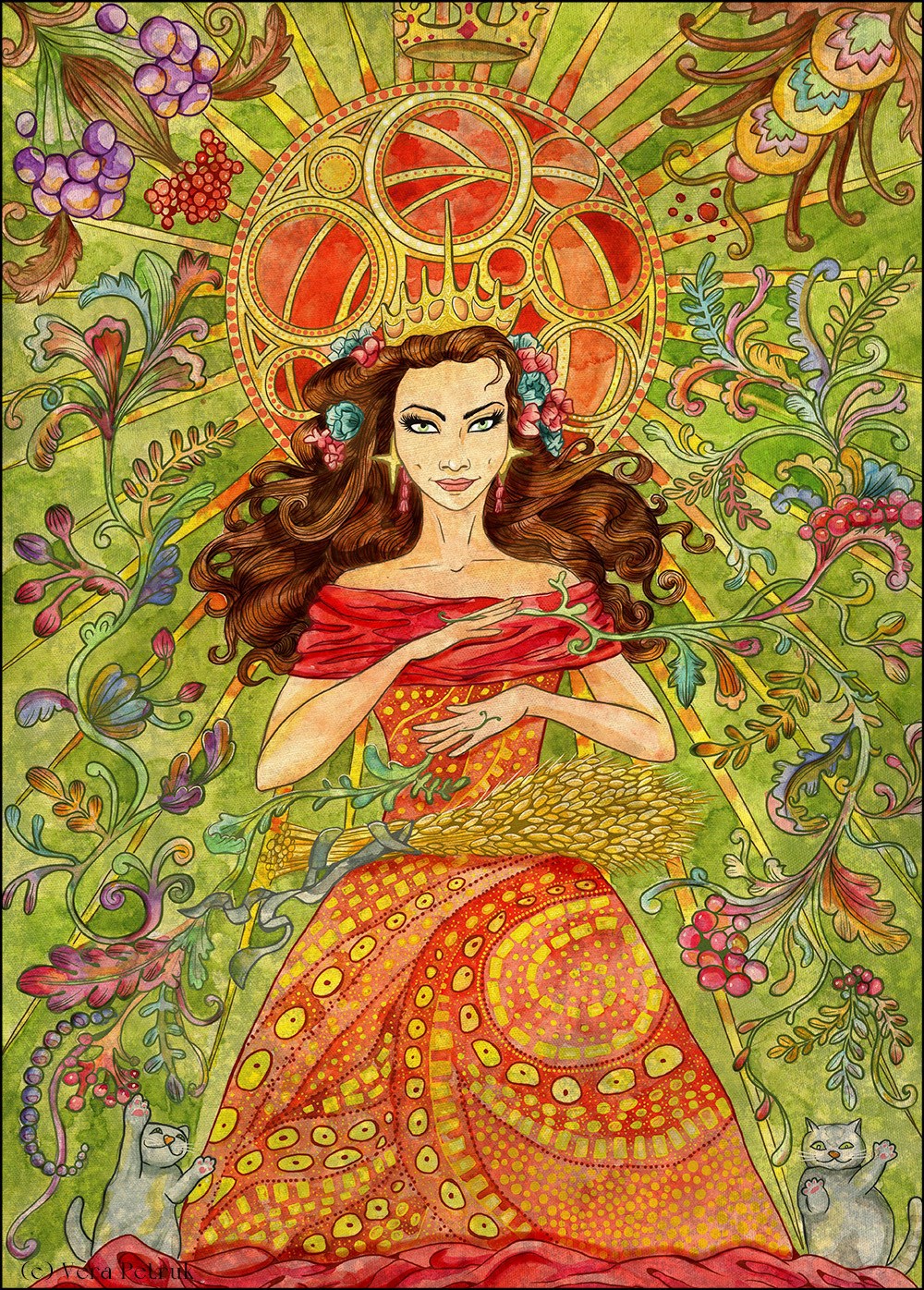 Это радостная карта с яркими цветами, соответствующими ее энергетике. Под покровительством Императрицы все процветает и растет. Она – сама природа и изобилие. Чтобы подчеркнуть эту символику, я изобразила плетущееся из ее пальцев фантастическое растение. Из классических образов оставила сноп пшеницы на коленях.