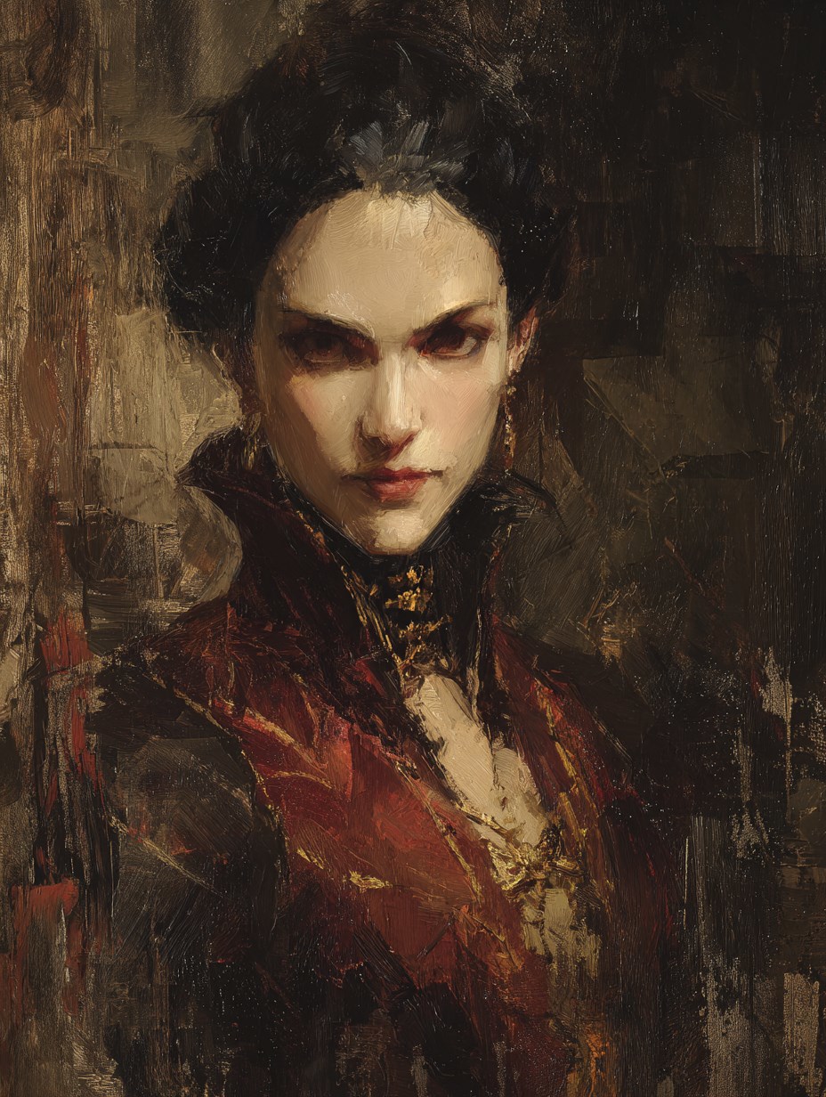 A large portrait of a beautiful noble woman. A very chiseled, intelligent, and stern face. Cherry-red eyes squint, carmine lips curved contemptuously. Black hair with a soft sheen. A fiery scarlet and black dress, high-necked, with wide sleeves and twisted gold cords. The cut of the dress is from the 18th century. Art by Vladyslav Yerko --chaos 5 --ar 3:4 --profile ajdobjp --stylize 150