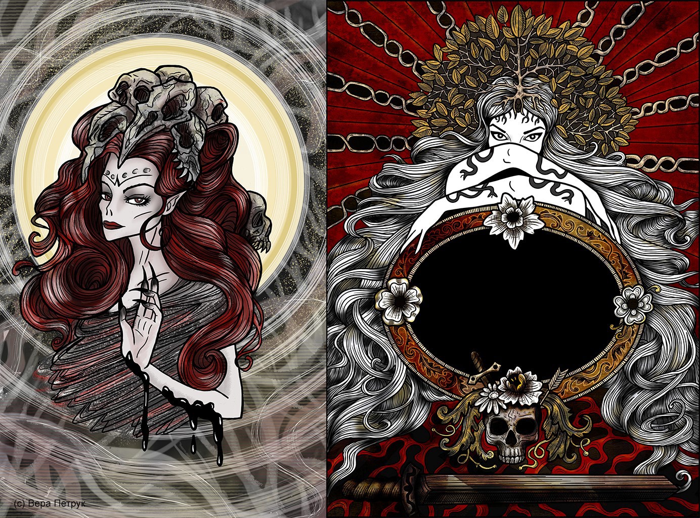 Иллюстрации, сделанные в Infinite Painter. Девушка с черепами на голове - это была визуализация монстра из романа про Кару, который я забросила, потому что забуксовала в истории так, что с трудом выбралась. Но там были такие замечательные сюжетные повороты и герои, что я их разбросала по другим книгам. "Шига Нечистоплотная" - так я назвала это чудовище, оно войдет в историю про Пламена, над которой сейчас работаю.