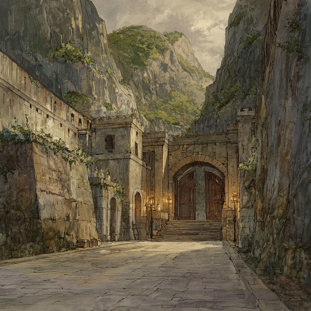 A fort guarding a mountain pass. A straight, paved road leads to a large gate. Edwardian era. Steampunk, manapunk --chaos 5 --profile ciz9kw6 --stylize 150