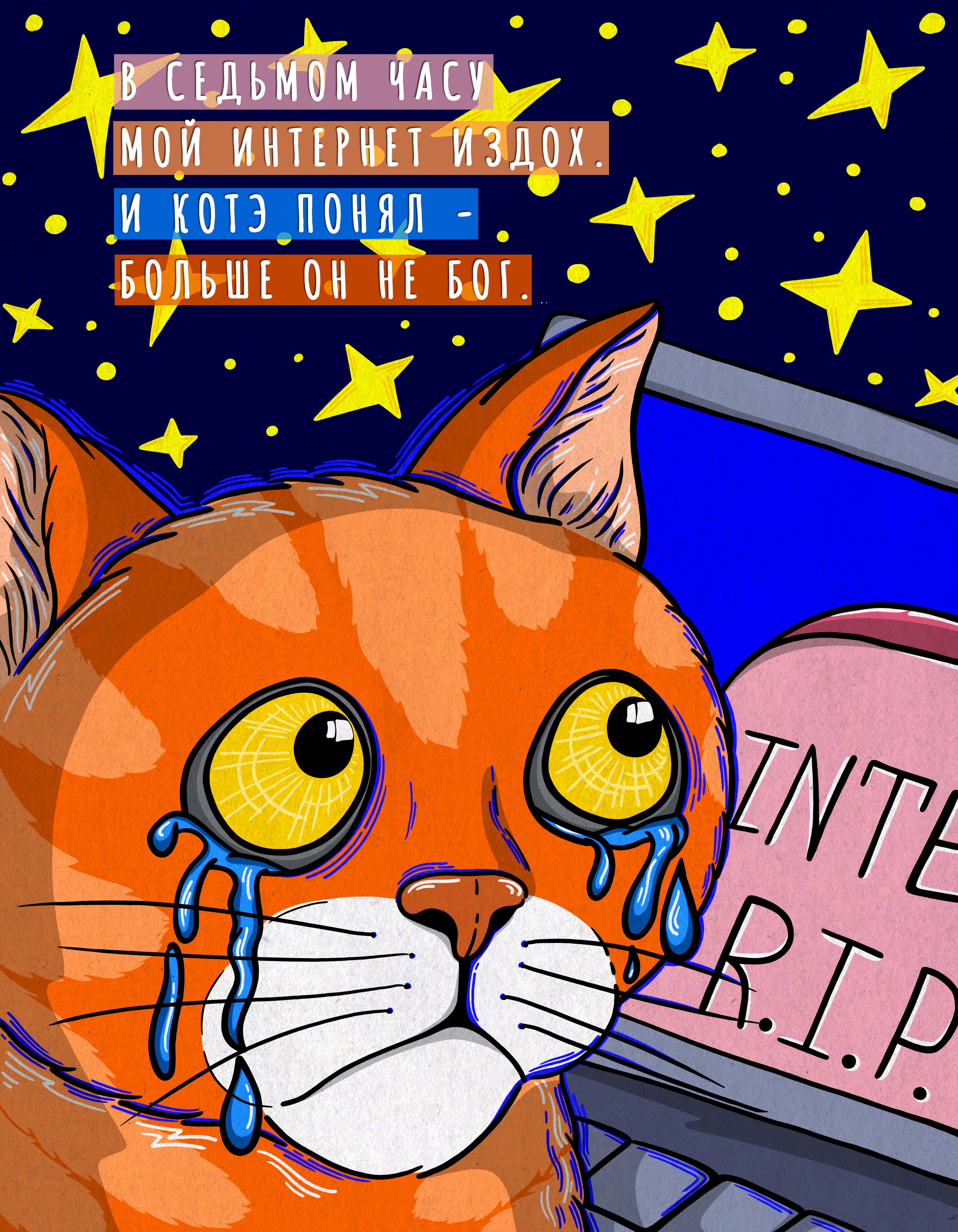 Иллюстрация #15 Автор: Irina Urbina В седьмом часу мой интернет издох.И котэ понял - больше он не Бог... диджитал, иллюстрация, интернет, котэ, арт, открытки 3 Пожаловаться