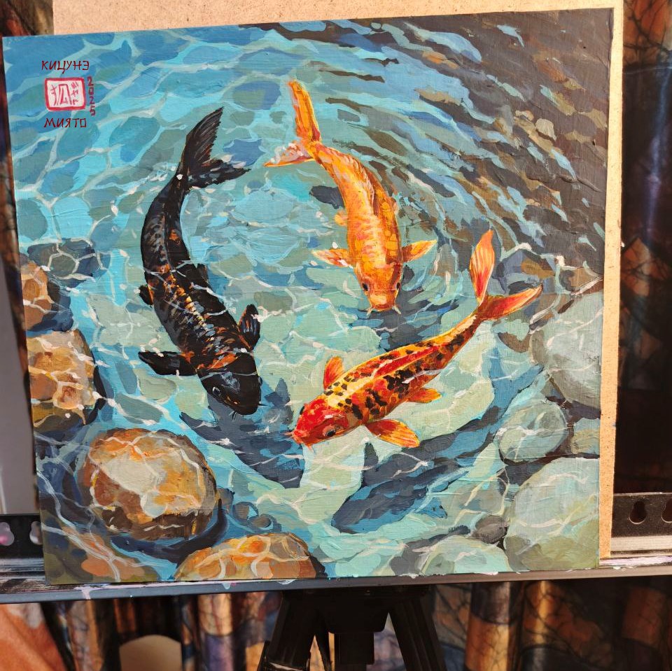 Давно хотела карпов кои, но страшно было начинать, ибо хотела я... чтобы была вода прозрачная, рыбки живые, солнечные блики... Но вот... вроде всё получилось...