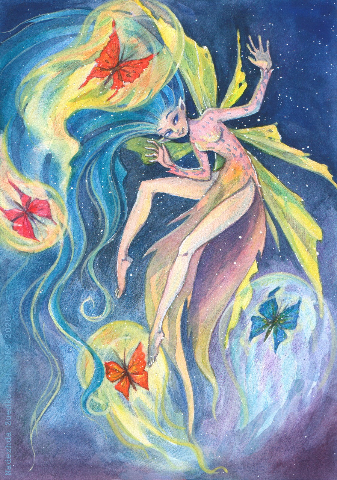 И вот интересно: в этот раз гуашь использовала по минимуму, для света, а акварель все равно ложится матово. Видимо, дело в нижнем слое карандашей.