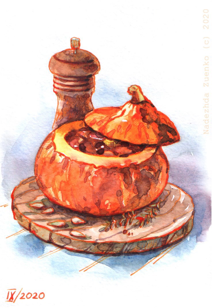 На манеже те же: бумага "Белые Ночи" целлюлоза А6, тушь Виндзор-Ньютон, акварель ГАММА "Студия" и две фоточки в тырнетах, одна с тыквой, а другая - с перечницей :).