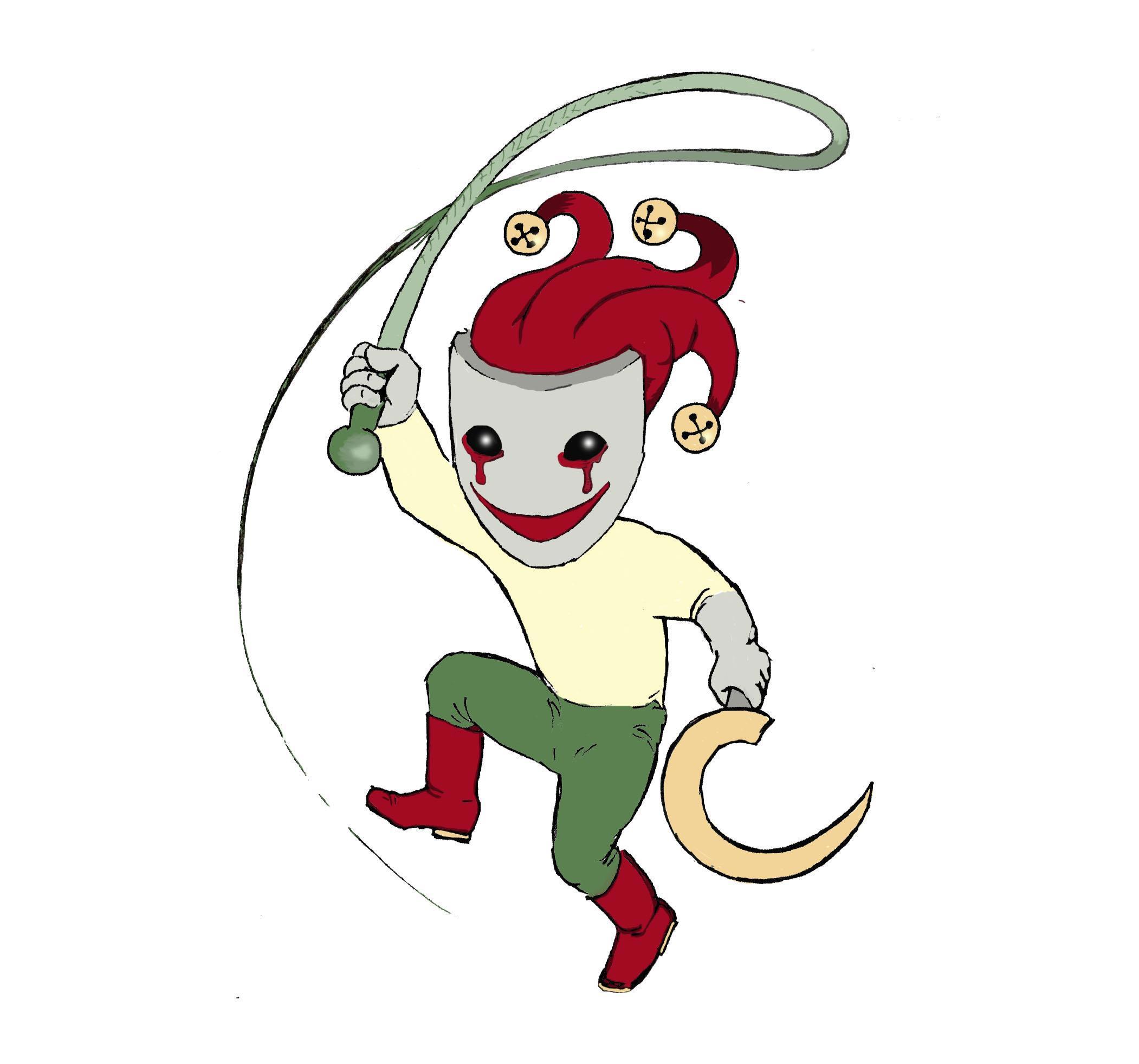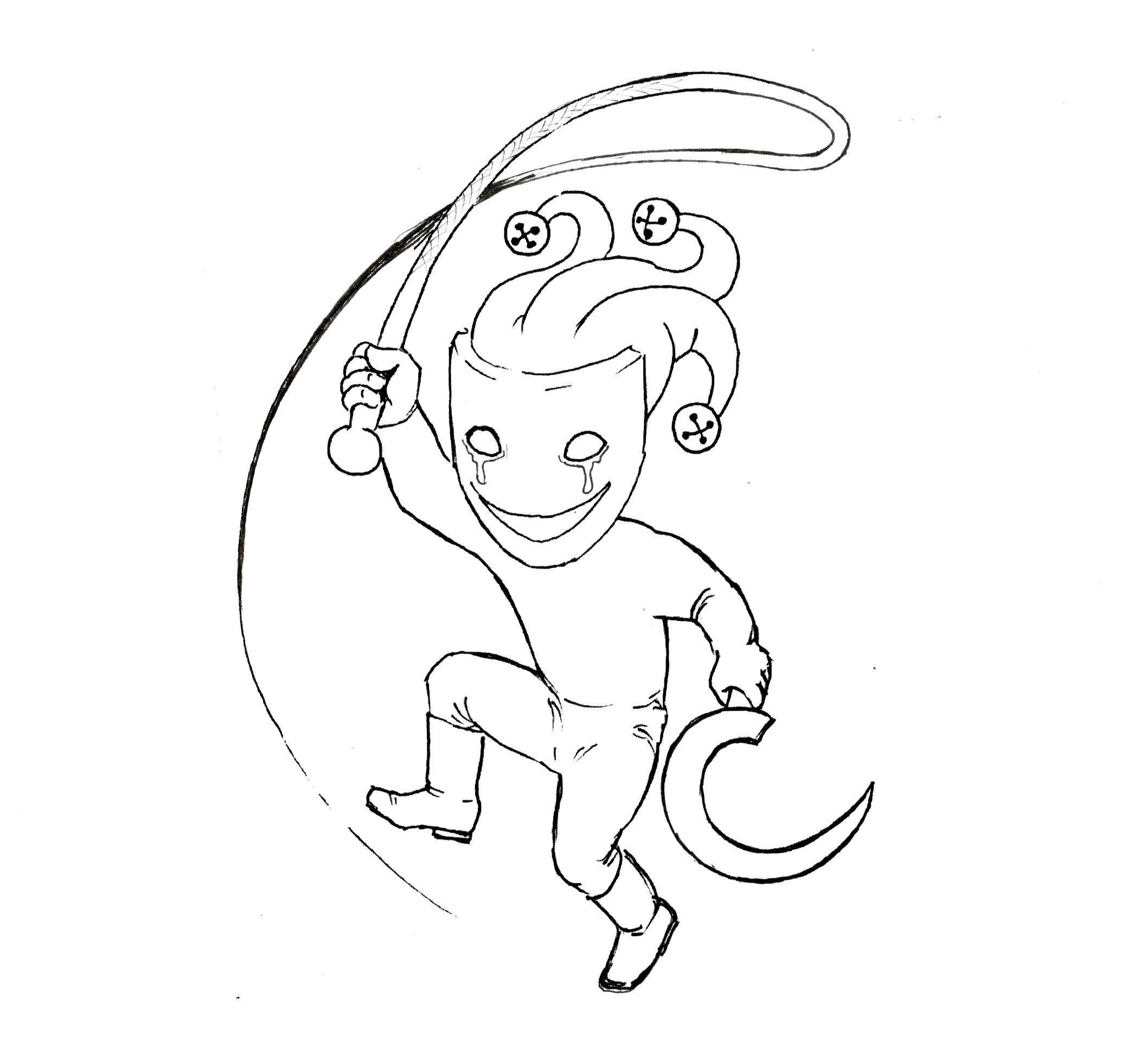 Рот и слёзки красные. глазные дырки чорные, кнут зелёный. Текст по стикеру: