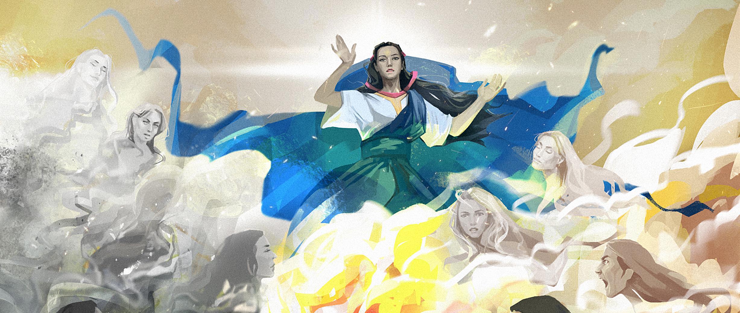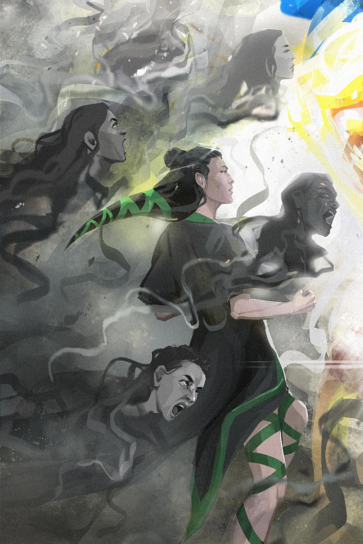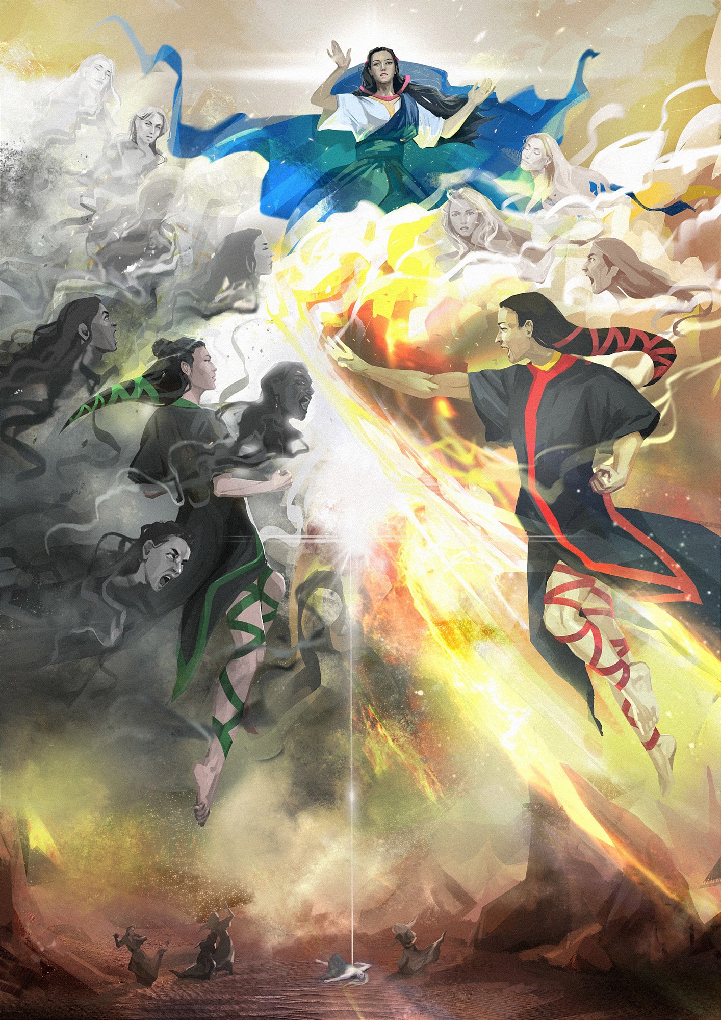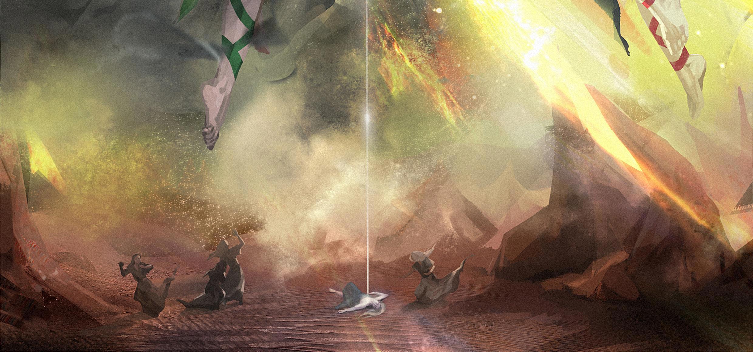 Иллюстрация к финалу "Пустыни Гаэ" глава 30. Столкновение сыновей Праматери Гаэ: пламенный Сэллас жаждет уничтожить Элейшу, окруженного тенями шебдов, ради будущего асайев. Но с небес является Праматерь, вызванная жертвоприношением гаэньши Гиеджи, и останавливает бой"