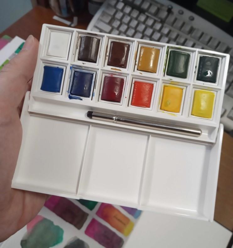 Почему я купила новый наборчик акварели Winsor&Newton "Cotman" на 12 полукювет? Может, потому что я забыла о том, что это так себе краски? Нет, не совсем так :). Во-первых, на ВБшечке была на него огромная скидка, аж до полутора тысяч. Во-вторых, меня соблазнил пенал-палитра. Даже по фото видно, что он должен быть очень компактным и удобным в работе. Ну и, наконец, в наборе заявлялись тёмные цвета (жженая умбра и синяя ФЦ), с использованием которых, я решила, можно будет делать тёмные замесы.