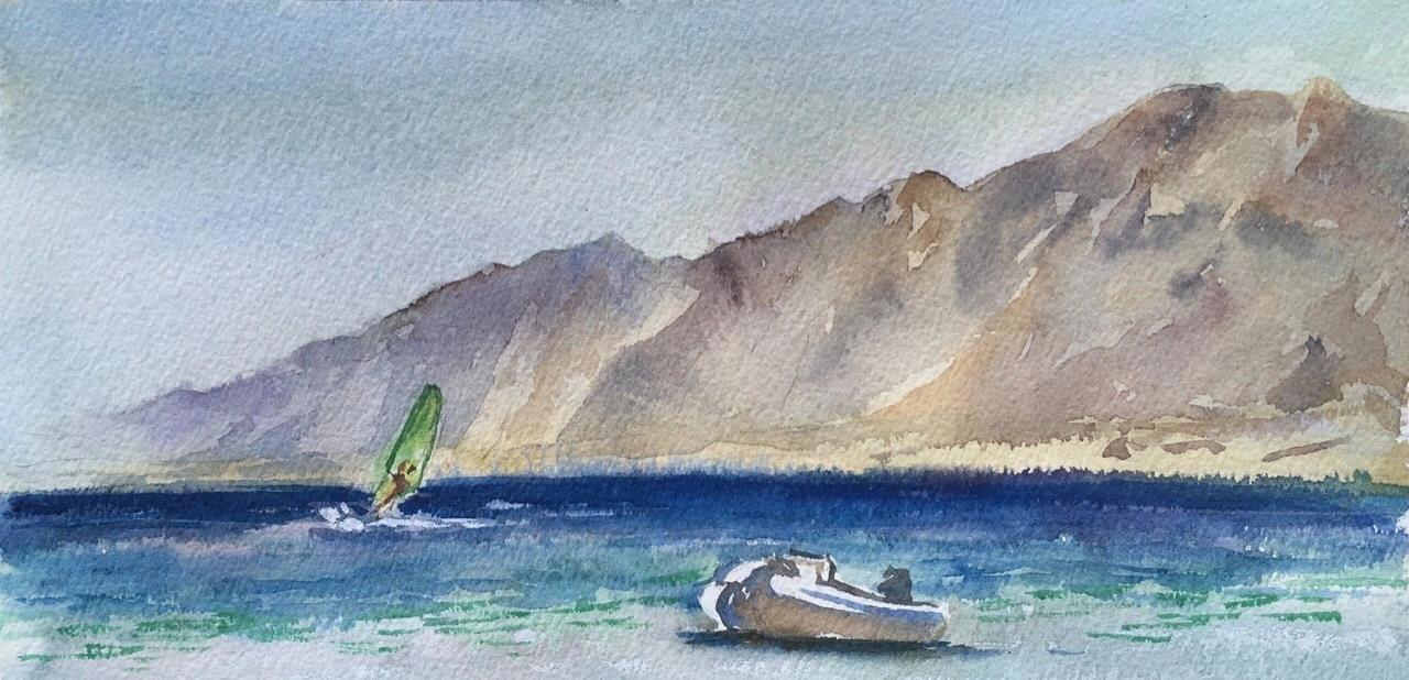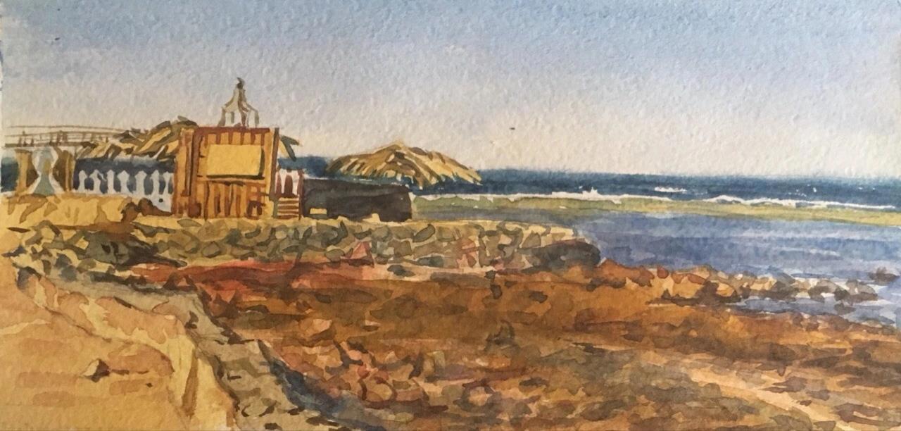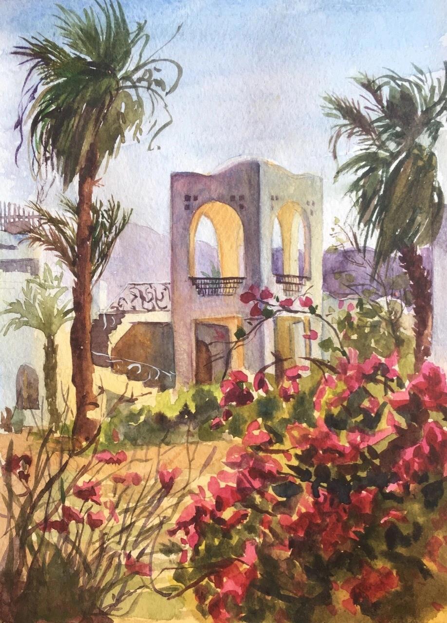 В далёком 2019 ездили на отдых в Египет, почти каждый день проводили на станции виндсёрфинга "Winderland".Сделала тогда много этюдов и зарисовок, большая часть как раз виды на станции)
