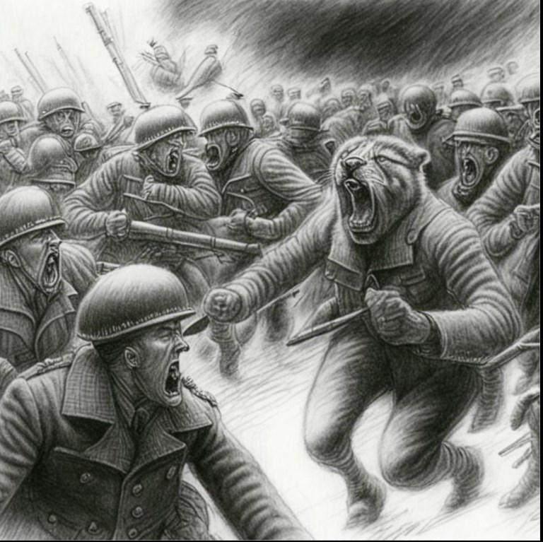 Откуда взялось животное в военной форме, зачем чел на переднем плане жрет погон и что за оружие торчит из кулаков аборигенов этой альтернативной вселенной - знает только мистер Кандински 2.1.