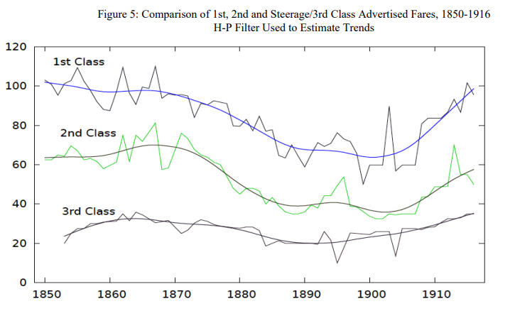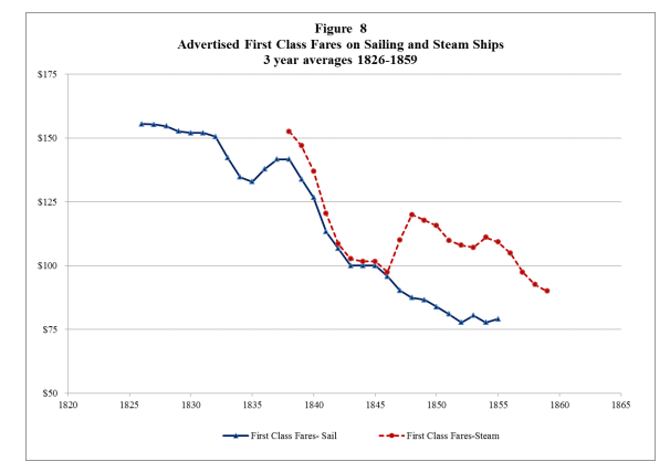 Сравнение цен на билеты 1-го класса для парусников и пароходов. С середины 50-х первый класс на парусниках не путешествует вообще.