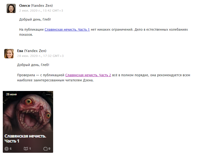 За время нахождения и публикаций на сайте постоянно писал в службу поддержки Дзена. Ни один вопрос фактически не решили. Постоянно отписки однотипные. Несколько случаев было, когда на один и тот же перечень постов мне показывали разные посты с ограничениями. То есть это как? Система каждому сотруднику показывает, что на разных постах ограничения? Получается, сотрудники Дзена даже не могут посмотреть на статью и ограничения посмотреть?