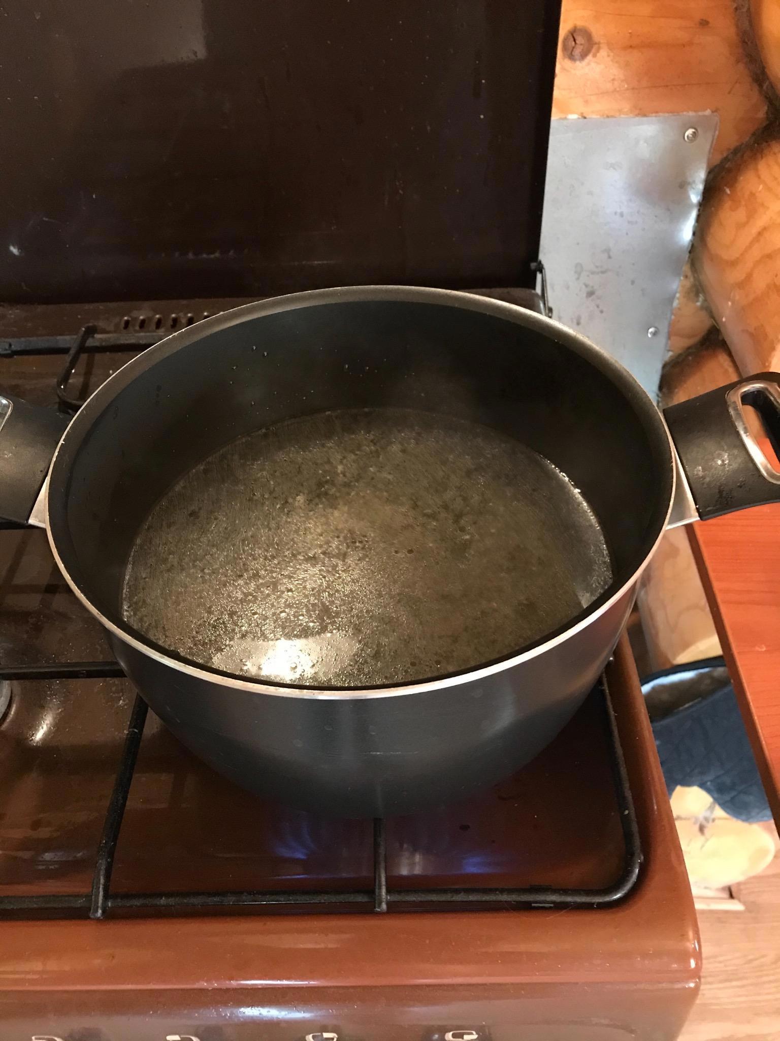Мясо - в кастрюлю! Вообще-то, я предпочитаю использовать одновременно два вида - и свинину, и говядину - но тут у меня нашлась только свинина - обрезки от субботнего шашлыка. Зато жирная! Что ж, так тому и быть...