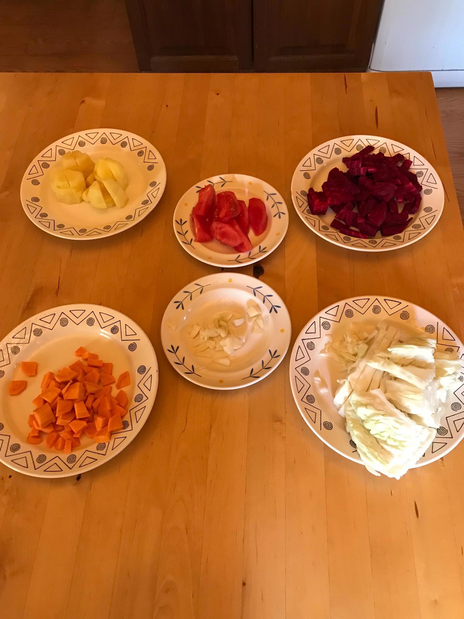 Подготовить овощи - капусту, картошку, свеклу, морковку, чеснок, очищенный от шкурки помидор: