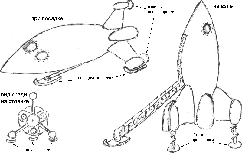 Мы и так уже допустили о-о-очень бо-о-ольшую вольность, выдумав одноступенчатый аппарат (настоящие ракеты все до сих пор многоступенчатые и это обосновал опять-таки ещё Циолковский, его формулой расчёта многоступенчатой ракеты пользуются до сих пор). И на нашем катере у нас есть ещё и всякие полезные приспособления. Вот посадочные лыжи для планирующей посадки. Причём опора передней лыжи служит так же домкратом, поднимающим сей скромный катер в вертикальное положение для старта с планеты. На ней же устроен складной трап - очень пологий, что облегчает проход по нему, например, с грузом на носилках. После установки в вертикальное положение катер опирается на три посадочных опоры-тарелки, имеющих пружинную амортизацию. Это нужно: