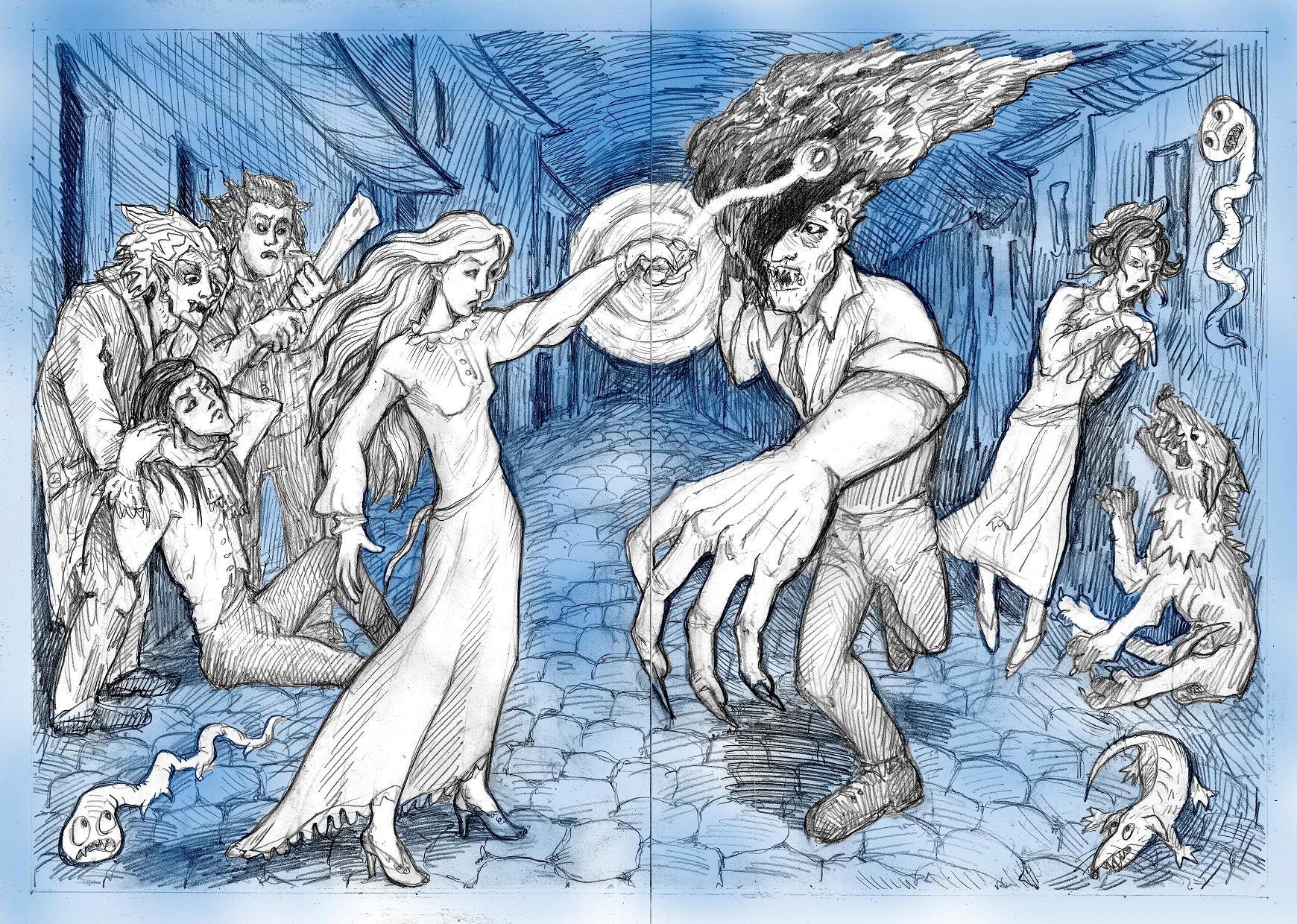 П.С. после некоторых размышлений линию посредине решила не убирать. Не, ну я могу, конечно, но а) лень, и б) так оно похоже на настоящую большую иллюстрацию с разворота книги.