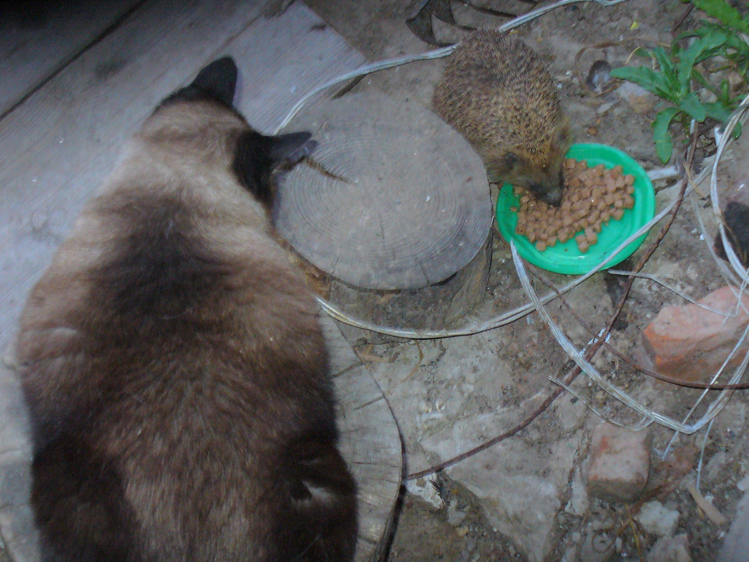 Милли совсем не жадная царица - хозяйка прайда, она и меня принимала за котенка, кормила мышами. Вот и ежика кормит: