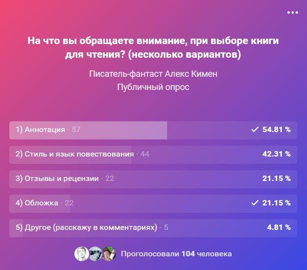 Я спросил: На что вы обращаете внимание, при выборе книги для чтения. (можно было выбрать несколько ответов). По результатам ответов 104 человек получилась следующая картина: