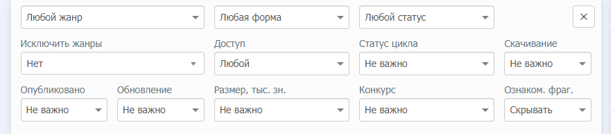 здесь уже мы можем отфильтровать жанр произведения тип и статус завершенности ну а при нажатии на заветную кнопку сможем выбрать еще несколько параметров