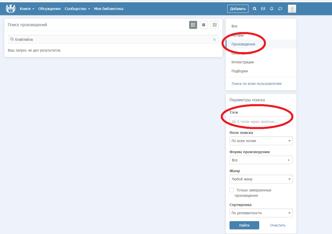 и с права в появившемся меню выбираем произведения теперь мы можем искать книги не только по жанру но и по тэгу произведения