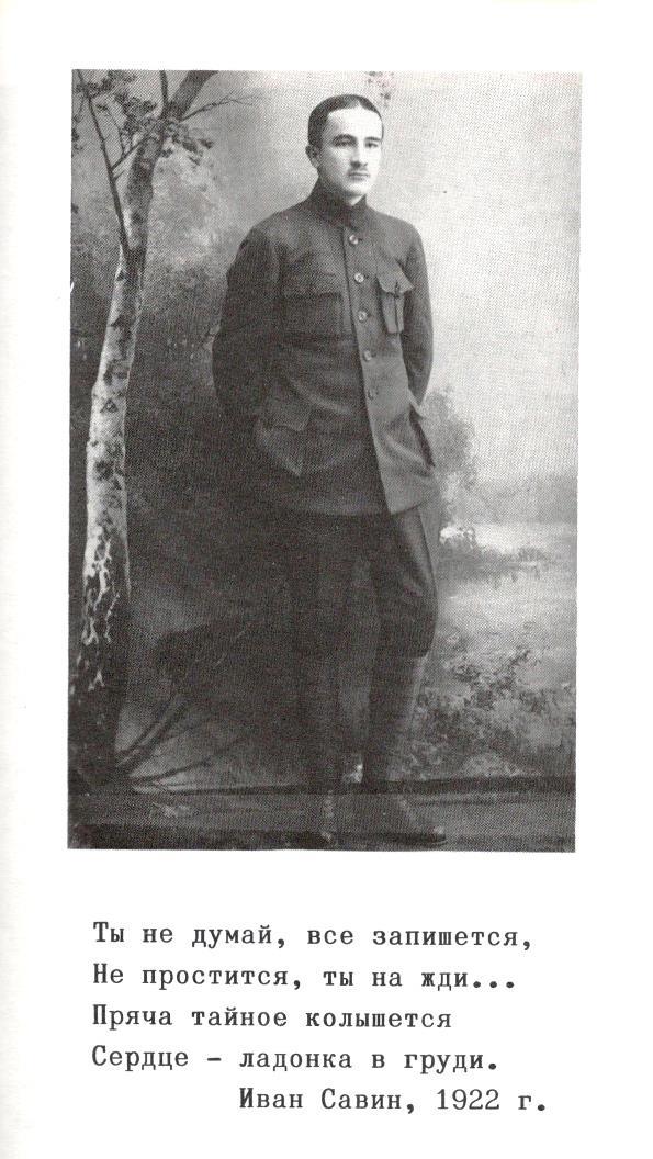 Измученный войной, физическими и душевными пытками, Савин вырвался в Финляндию в 1922г., как финский гражданин. - Посмотри — душа седая в двадцать три..., - это было написано им в тот год. Судьбой поэту было отпущено еще пять лет творческой жизни.