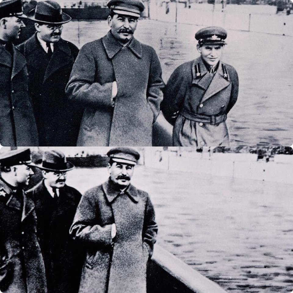 Как пример: фото Сталина с доблестным наркомом Ежовым и... без него (после того как Ежов был объявлен террористом и расстрелян).