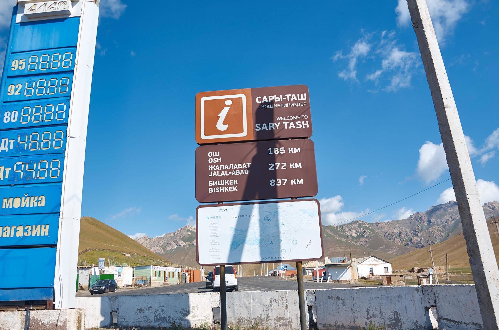 Еще немного и впереди темнеют новые просторы, горы расступаются в стороны, перед нами знаменитая Алайская долина, которая находится на высоте 3000 метров. Мы подъезжаем к поселку Сары-Таш, перекрестку местных дорог. Прямо по курсу продолжается легендарный Памирский тракт, налево идет трасса к китайской границе, а нам поворачивать в правую сторону и двигаться вдоль Алайского хребта. Сары-Таш последнее место, где можно обменять валюту, в наличии имеются также магазины и кафе. Есть АЗС, то есть настоящий кусочек цивилизации, особенно для тех, кто переваливает через Памир из Таджикистана. Там пару дней дорога идет на высоте 4000 метров, сейчас мне жутковато. Вот пример местного отеля и самого поселка. Как ни странно, но мобильная связь и интернет отличные.
