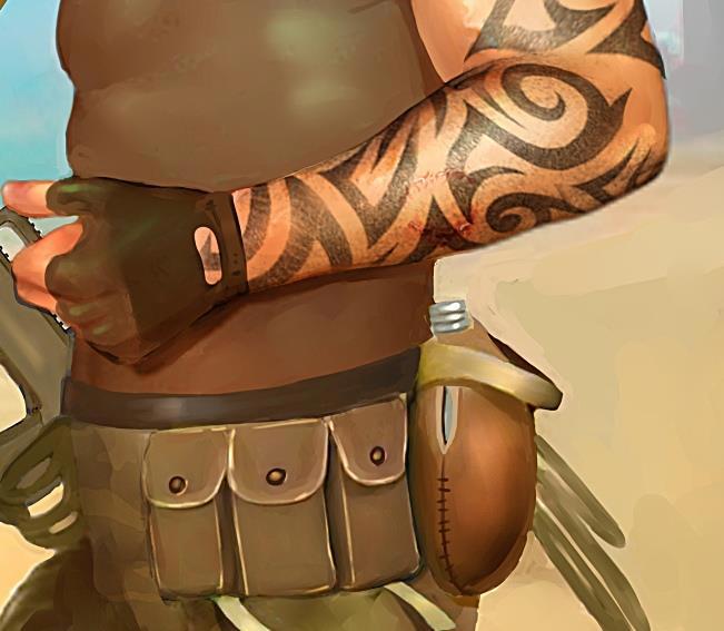 ТЗ Мужчина-наемник, морда кирпичом, темные волосы, шрам на глазу и щеке, татуировка закрывающая шрам от укуса зомби, армейский жетон и медальон, и еще кучка мелочей.