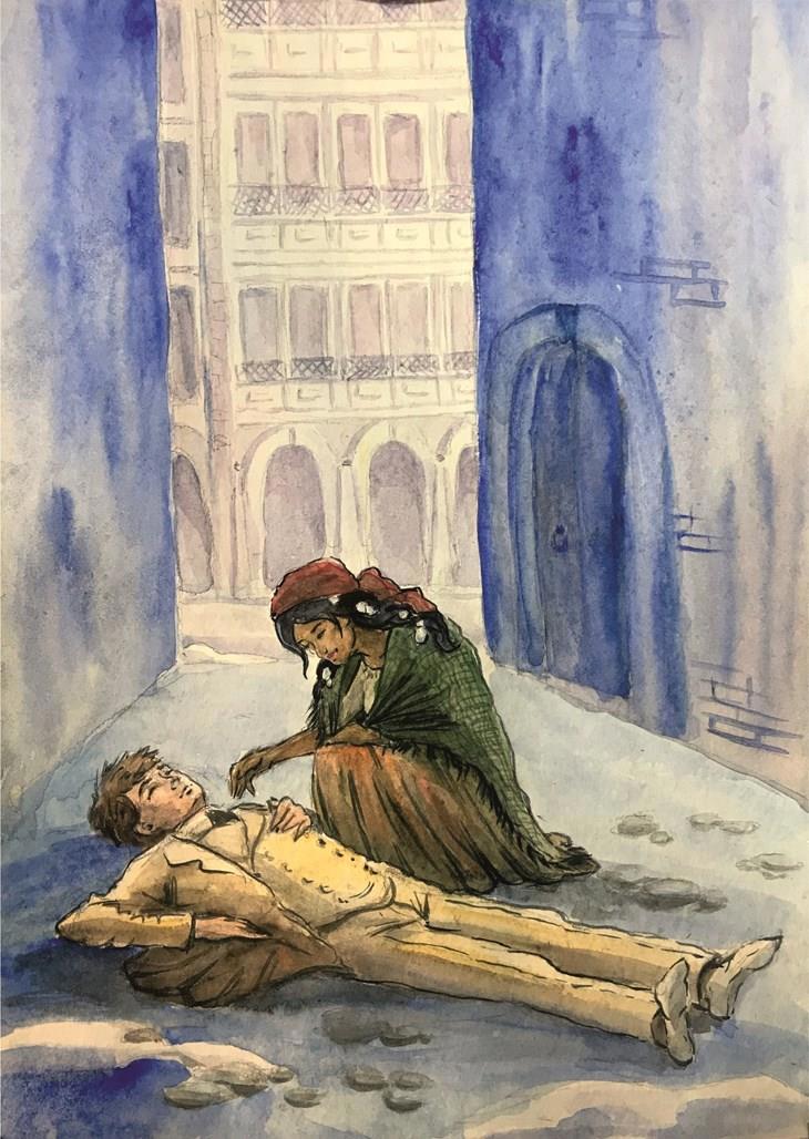 Вот такая чудесная иллюстрация мне досталась сегодня от Vinder Anastasia. Мне тут нравится решительно всё: и цвета, и позы героев, и детали их одежды, и контраст между подворотней, где напали на доктора, и прилегающей улицей. За цыганку с монетками в волосах отдельное спасибо. 🌹  Действительно прям как картинка из книжки))