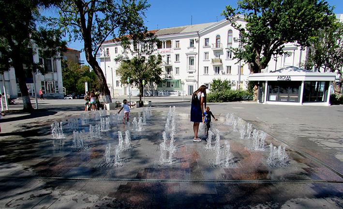 На площади- те самые фонтанчики. При свете дня- конечно выглядят не очень... Но дети всё равно рады, собачки- тоже.