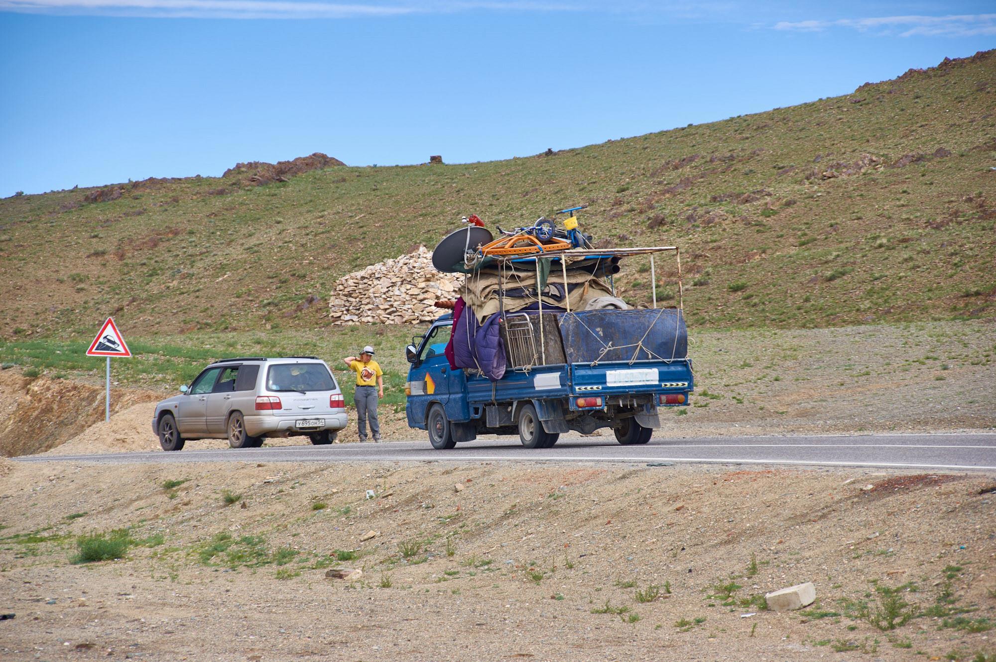 Похоже, что тело уже свыклось с ночевками на камнях. Но все же советую брать в эти места самонадувающиеся коврики, так будет намного удобней. После завтрака стартуем дальше. На перевале около города Ховд отмечаю несколько интересных сцен. Сначала мимо нас проезжает армейский ЗИЛ 131, переделанный под автобус. В окнах много милых старушек путешественниц. Позднее столкнулись с ними в супермаркете, это оказались австралийские пенсионеры. Путешествуют с самым из возможных комфортом. Этот армейский грузовик всегда славился своей проходимостью. К сожалению, он попал только на видео, а вот кадр с современными кочевниками представлю. Мы раскрыли-таки тайну местных пригородов с многочисленными гэрами-юртами. Оказывается, нынешние большие семьи, которым принадлежат пастбища, работают вахтами. Когда она заканчивается, то весь скарб загружается на небольшой грузовичок, и семья отправляется отдыхать в цивилизацию. Здесь я запечатлел именно такой переезд. Удобно, не правда ли?