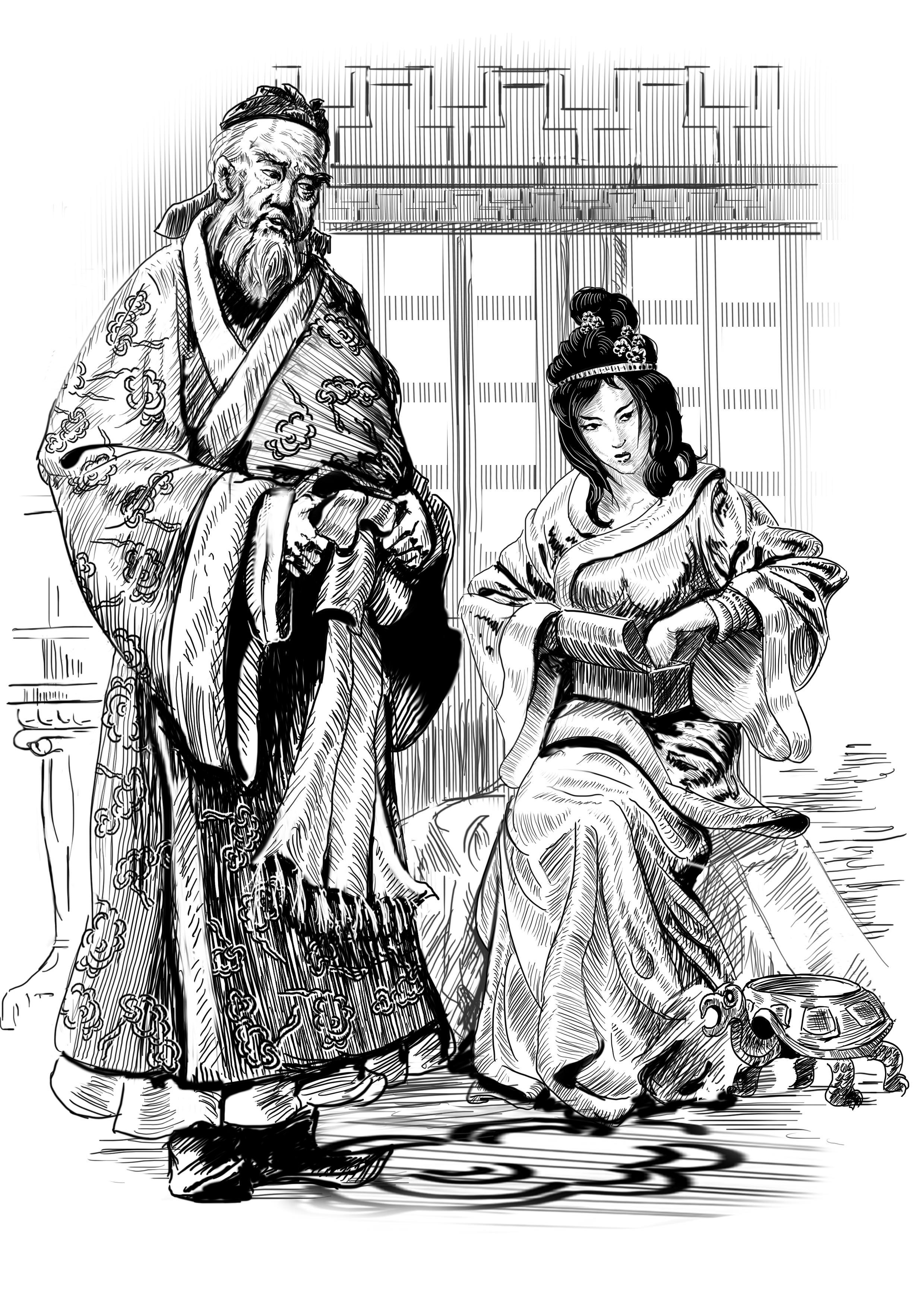 Первым опомнился длинноусый придворный в черном халате, расшитом голенастыми драконами, и при поясе тайвэя -- начальника стражи.