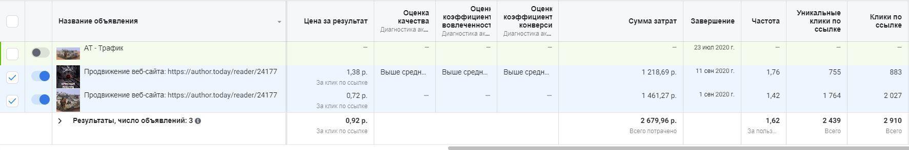 После этой рекламной кампании на 2 недели я сделал ещё 1 на неделю с целью направления трафика на страницу книги на ЛитРес, эксперимент заключался в проверке тезиса, что на ФБ читают, но не покупают. Это правда - неделя рекламы страницы книги на ЛитРес показала всё такие же хорошие результаты по кликам, но результировала лишь в 1 (одну) купленную книгу по итогам отчётного периода.