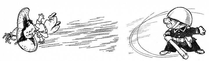 - "Резиновая палка"! - передразнил полицейский. - Вот и видно, что ты  осел! Это усовершенствованная резиновая дубинка  с электрическим  контактом. Сокращенно - УРДЭК. А  ну-ка, стой смирно! - скомандовал он.  Р-р-руки по швам! И никаких р-разговоров!»