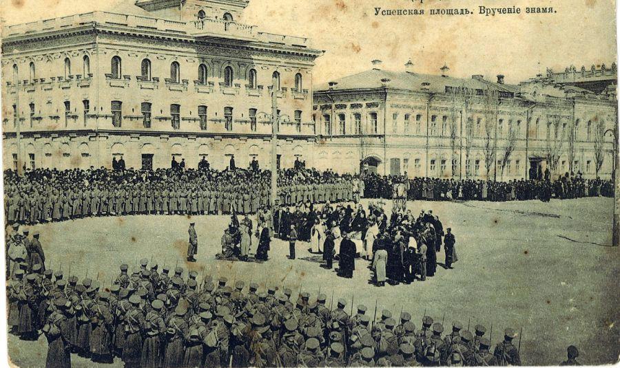 В 1914 году началась Первая Мировая, соседний слева особняк (построенный в 1912 году Дом купца Воронина - того самого, который выкупил руины и восстановил Дом Божескова) владелец отдаёт под офицерский госпиталь. Здесь, на Успенской площади, в 1915 году проходило торжественное вручение знамени, но видна и Мариинская гимназия:
