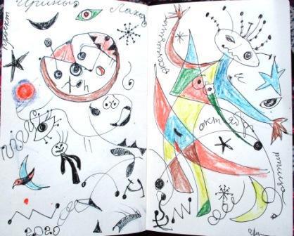 Нам нужно было нарисовать свою работу в духе этого художника-сюрреалиста. Для этого вначале нужно было составить Словарь символов, который использовал художник в своих работах Я взяла свой новый, привезённый из Сочи, скетчбук, открыла в интернете каталог работ Жоана Миро и принялась перерисовывать элементы, обнаруженными в них.