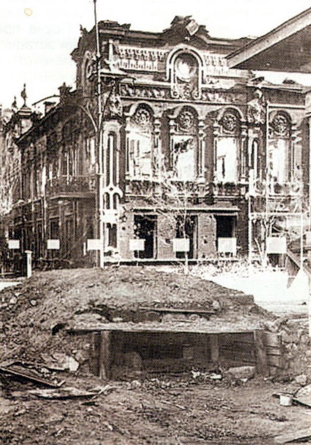1943 год. Битва позади, ещё не убран пулемётный дзот посреди уже давно не Княгининской, а Рабоче-Крестьянской, а что со зданием? Да, отсутствует верхушка угловой башни, выбиты окна, но каких-то очень уж страшных разрушений нет. На совесть всё-таки строили в девятнадцатом веке: