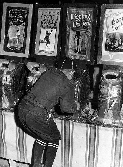 К середине 20 века максимальной популярностью пользовались именно эротические аппараты. Особенно в Америке. Более подробно можно почитать о развитии, а главное о том, кто это всё затеял и чем всё закончилось - вот здесь. А пока фотография того, как они были популярны и насколько вседозволенными