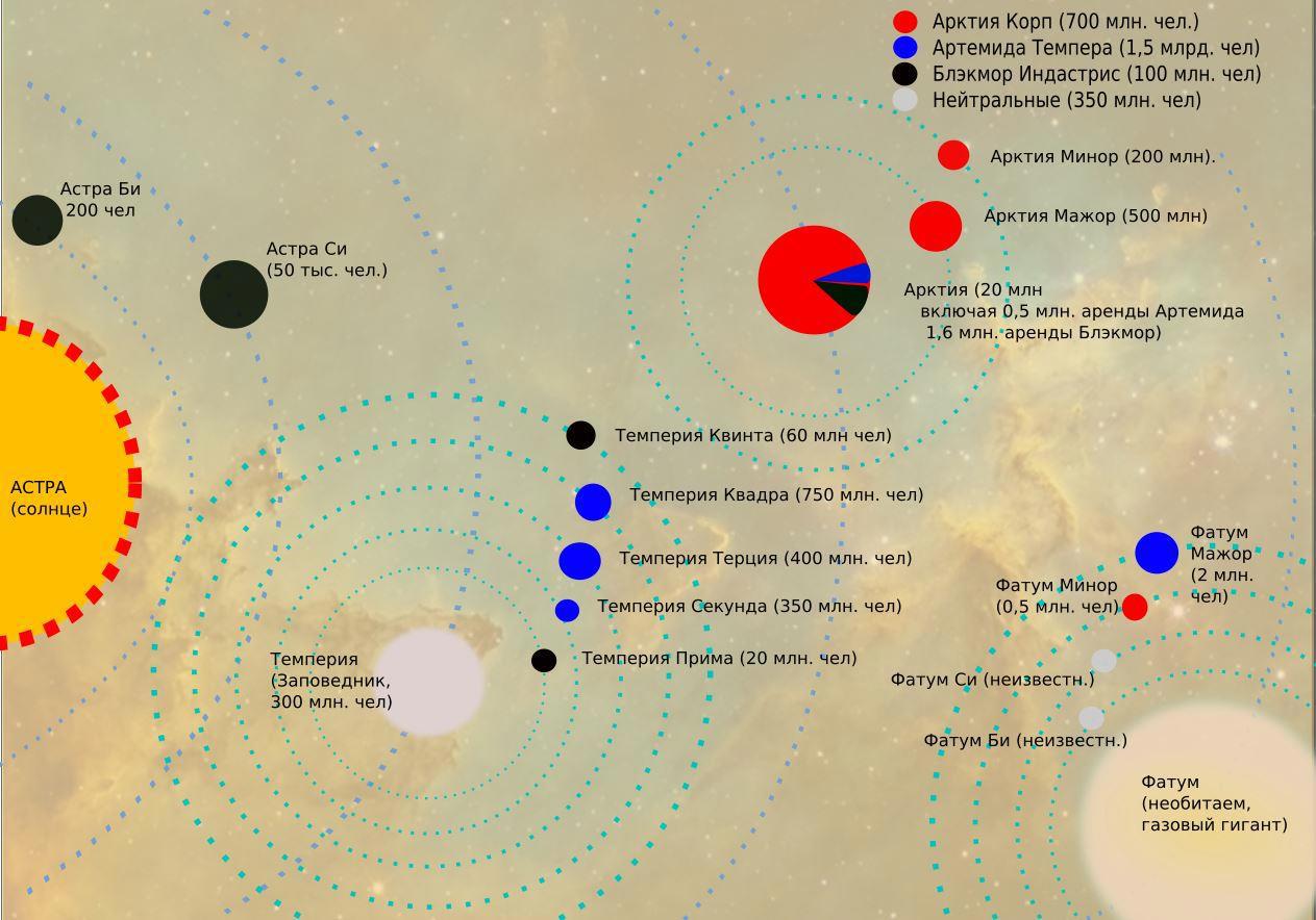 Арктия - земного типа, с гравитацией 1,2G, с малопригодной для жизни атмосферой, 90% территории принадлежит Арктии Корп (20 млн в купольных поселениях), 10% - в аренде у Блэкмор Индастриз и Артемиды Темпера. Два спутника обитаемы, население - 200 и 500 млн человек.