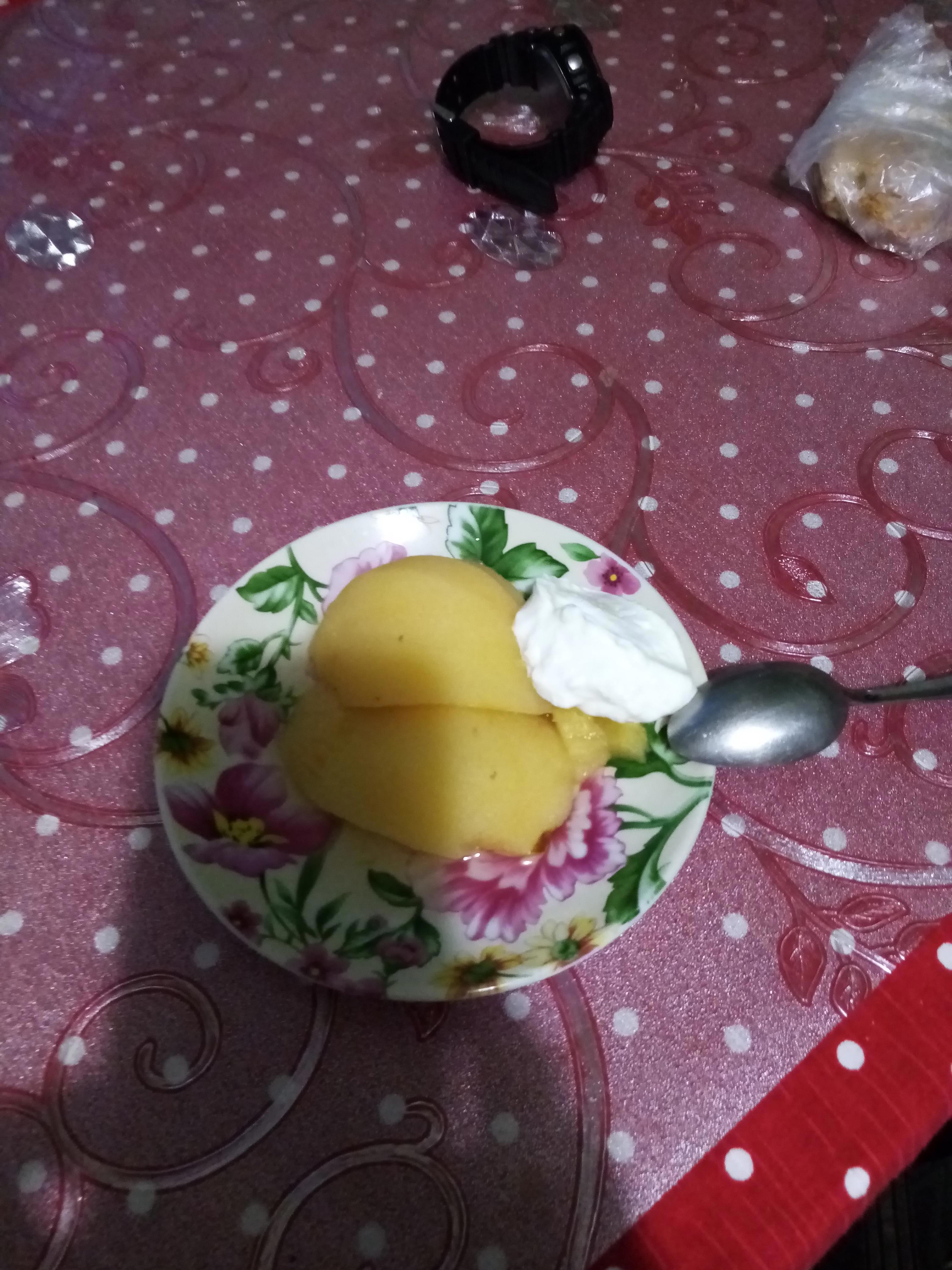 Минут через сорок она становится мягкой и готовой, только я положила слишком мало сахара и она осталось просто желтой, хотя должна была покраснеть. Ну и ладно, достала себе два кусочка и с холодненькой сметаной схомячила. Получилось вкусно, но сахара нужно больше, тогда айва приобретает красивый розовый цвет и есть ее еще вкуснее.